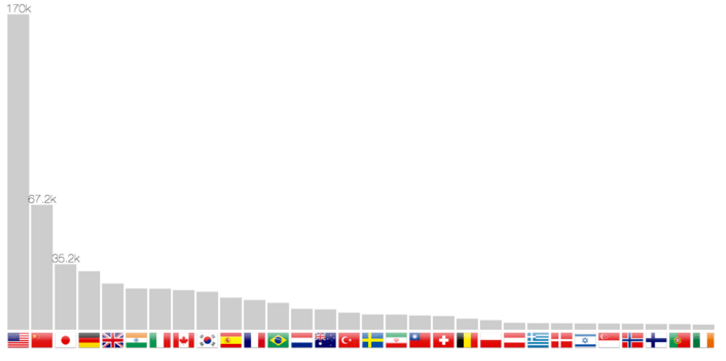 Figura 6: um mapa-múndi de calor, onde as cores que variam de luz laranja para vermelho mostra o número de publicações para o ano corrente.