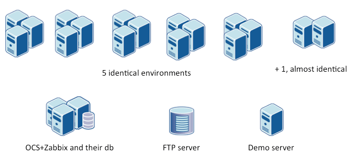 On the project we have five environments of three computers each: one web server (Apache), one app server (Tomcat), one database server (PostgreSQL). Plus one ftp server, plus two monitoring servers (Zabbix)(which host a web server and a database server) and deployment server (OCS). Plus a demo server. Plus two servers for an other project (which host the same components).