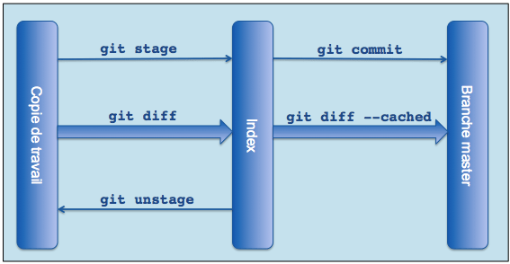 Un git stage monfichier met à jour l'état de monfichier sur l'index à partir de l'état de ce fichier dans la copie de travail. Attention toutefois à bien comprendre que git stage ajoute les modifications à l'index au moment où la commande est exécutée. Cela veut dire que si monfichier est modifié après un git stage, ces modifications ne seront pas présentes sur l'index et ne seront donc pas commitées lors du prochain git commit. Ceci nous permet de contrôler finement les modifications que l'on souhaite inclure dans le prochain commit (pour aller plus loin, je vous conseille de tester git stage --interactive : Interactive adding).