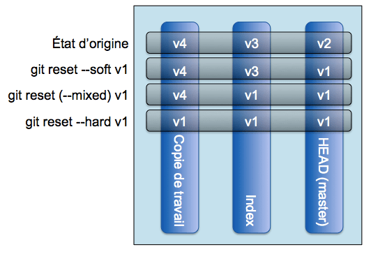 La commande reset permet, entre autre, de "remettre en état" l'index et/ou la copie de travail. Nous l'utilisons principalement pour 3 choses :