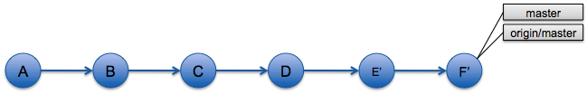 En utilisant git pull --rebase (ou git rebase origin/master), les commits qui n'existaient que sur la branche master (E et F) sont supprimés et réappliqués à la suite des commits de la branche origin/master. Ce sont de nouveaux commits (E' et F'), c'est pour cela qu'il ne faut pas faire un rebase sur des commits qui sont déjà présents sur un dépôt partagé. /git-rebase_resize.jpg)
