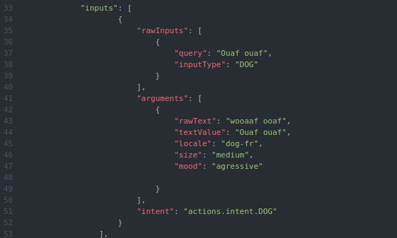 | textValue | Value transcribed in the default language of the Google Home device | “Ouaf ouaf”, “Miaou”, “Meuh”, “Onk” |