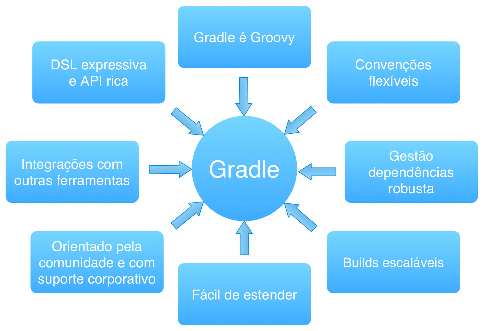 Vamos dar uma olhada no que diferencia o Gradle de seus concorrentes: seu conjunto de recursos nativos (figura). Essa imagem mostra muito bem o que o Gradle tem que o diferencia de outras ferramentas existentes no mercado.