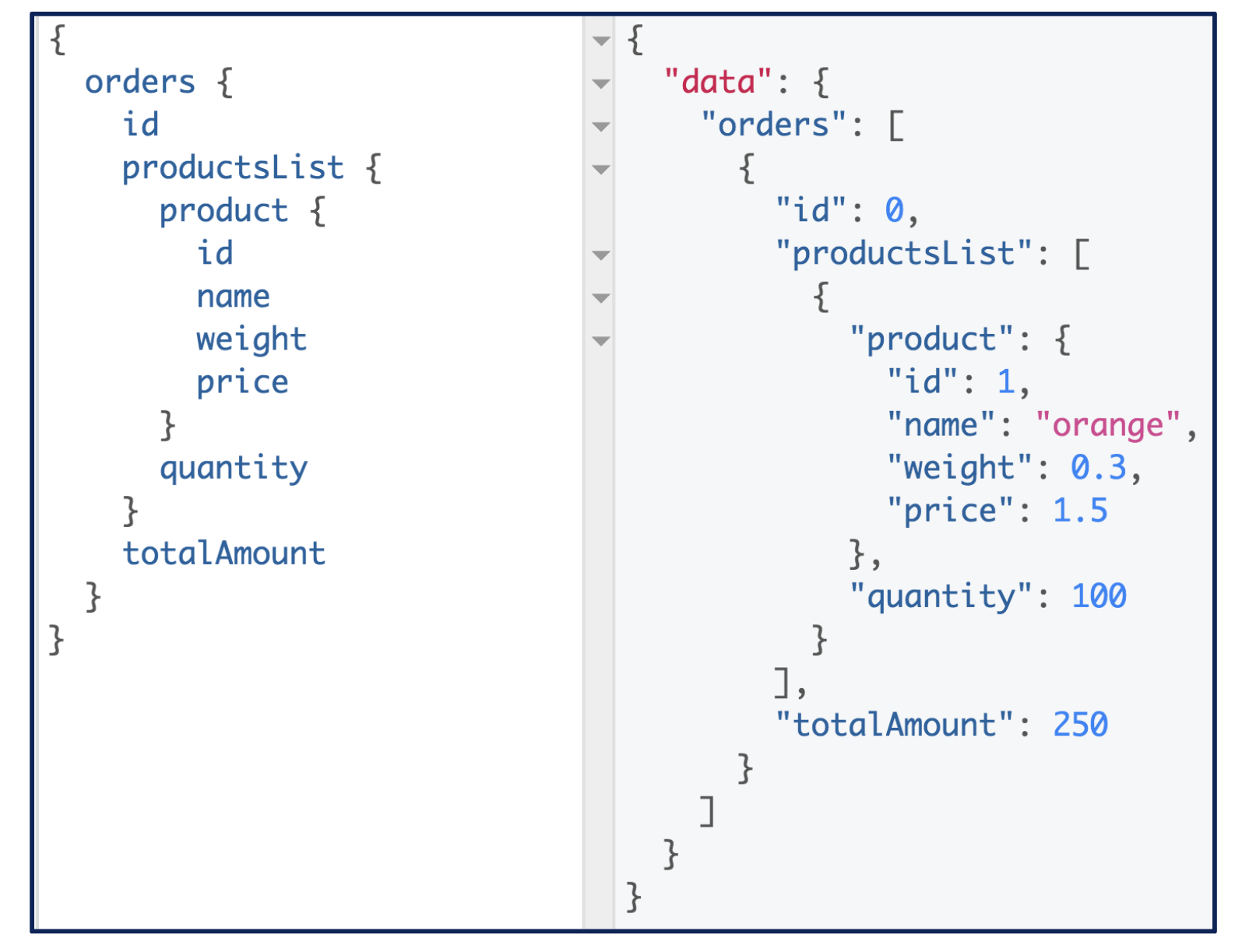 GraphQL est en premier lieu un langage de requête. Celles-ci ressemblent comme on peut le voir dans l’exemple ci-dessous à la réponse que l’on souhaite obtenir sans les valeurs. Le client choisit alors quels champs de chaque Objet (ex: orders) il souhaite et dans quel ordre. La réponse du serveur GraphQL sera alors identique à l’ordre dans lequel a été formulé la requête.