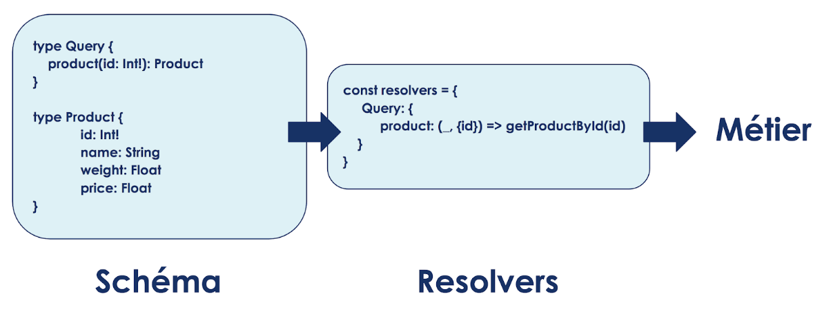 Une fois la requête vérifiée de part sa syntaxe et le schéma du serveur, GraphQL fait appel aux resolvers. Un resolver associe une fonction de l’API (calculs, récupération de données de la base de données, appels à une autre API, etc...) à une requête ou une action définie dans les objets globaux du schéma, Query et Mutation. C’est donc à ce niveau que l’on fait le lien entre les entrées des requêtes et les arguments des fonctions (id dans l’exemple ci-dessous) mais aussi que l’on regroupe les règles de fonctionnement de notre API telle que l’authentification ou la gestion des droits.
