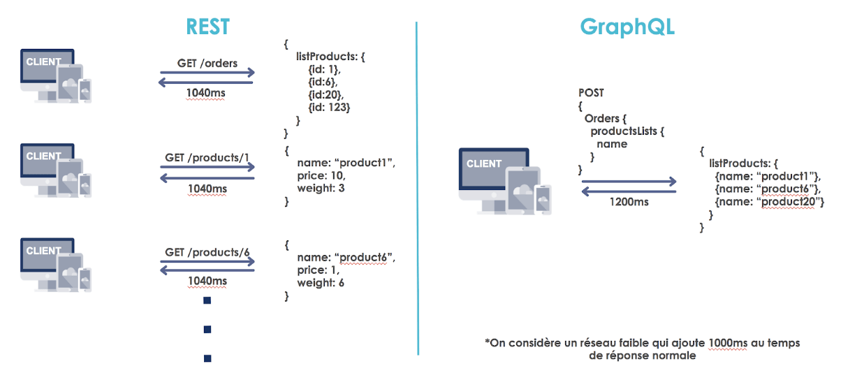 Considérons l’exemple ci-dessus. On suppose qu’en général une requête GraphQL est plus longue à arriver à cause de problématique de cache (sur lesquels nous reviendrons) ou du fait d’un temps d’exécution serveur plus important (~+50ms). Donc en temps normal la requête GraphQL sera en général plus lente à arriver (ici par exemple 200ms au lieu de 40ms en temps normal). Mais, si le nombre d’appels augmente, ici au dessus de 5, alors le temps de réponse du serveur GraphQL est amorti. En revanche dans le cas où le transport des données est 10 fois plus important (+1000ms, 1200ms au lieu de 1040ms) cela devient alors négligeable et un seul appel s’impose.
