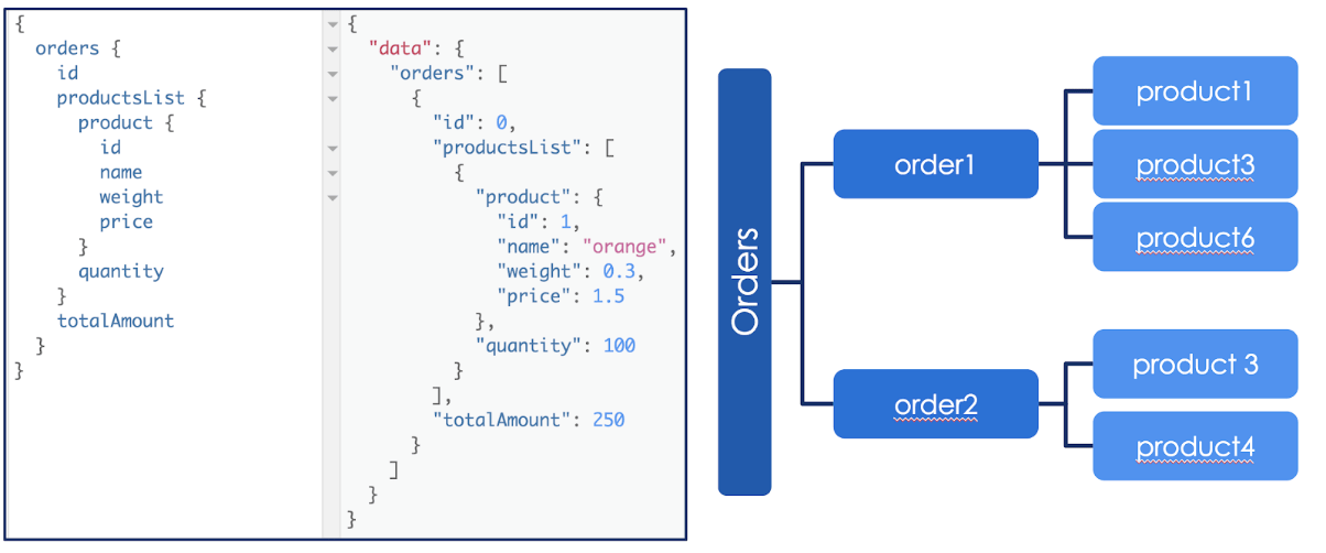 Par exemple, dans la requête basique ci-dessus on peut imaginer un premier niveau de notre arbre avec toutes les commandes (orders). Puis à chaque branche order, dans le champ inventaire (productsList), de nouvelles branches pour chaque produit de la commande. Dans cet exemple de requête nous n’avons qu’une seule commande avec un seul produit mais évidemment l’utilisation de GraphQL devient pertinente lorsque l’arbre est plus profond et plus fourni comme l’exemple de droite.