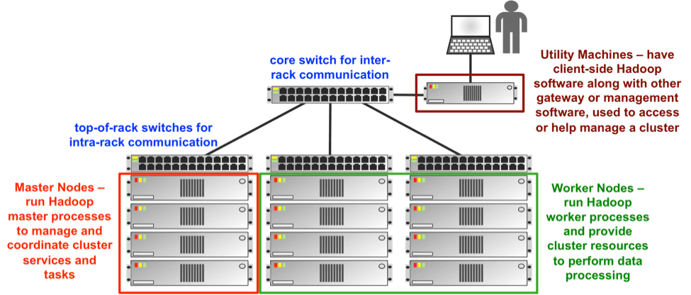 Basé sur le principe des grilles de calcul, Hadoop fractionne les fichiers en gros blocs et les distribue à travers les nœuds du cluster. Il comprend plusieurs composants : les principaux étant les nœuds maîtres (Master nodes) et les travailleurs (Worker nodes). Les nœuds travailleurs sont parfois appelés nœuds esclaves (Slave nodes).