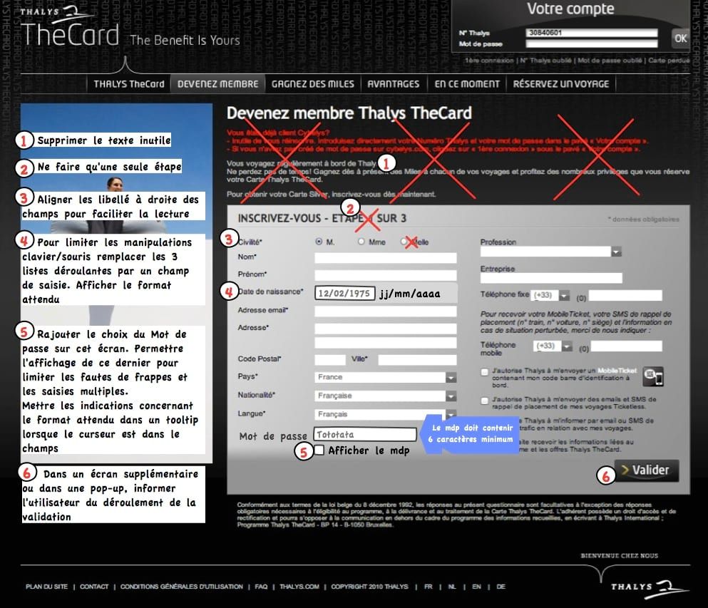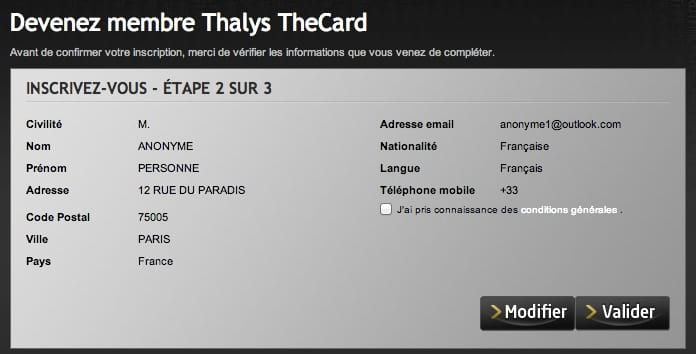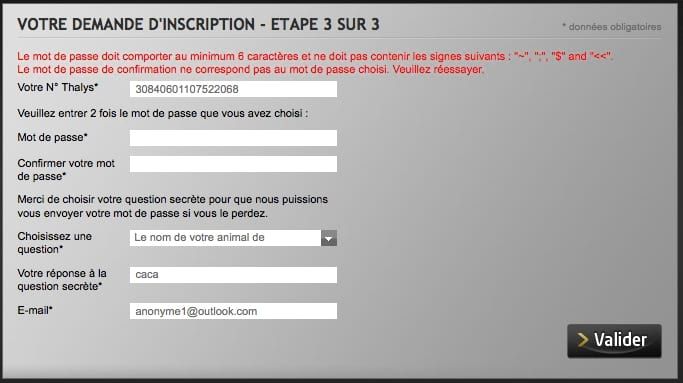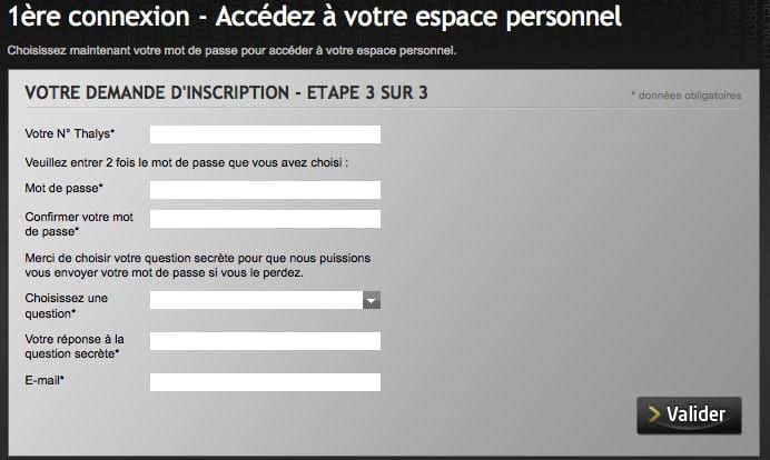 Je souhaite profiter des avantages de la carte le plus tôt possible, et, comme je dois rapidement réserver un billet de train pour mon prochain voyage, j'en profite pour souscrire. Qui dit inscription dit saisie du légendaire et incontournable formulaire d’inscription, formulaire que j'abomine... Je compte vraiment sur Thalys pour que ce moment soit le plus rapide et le moins douloureux possible.