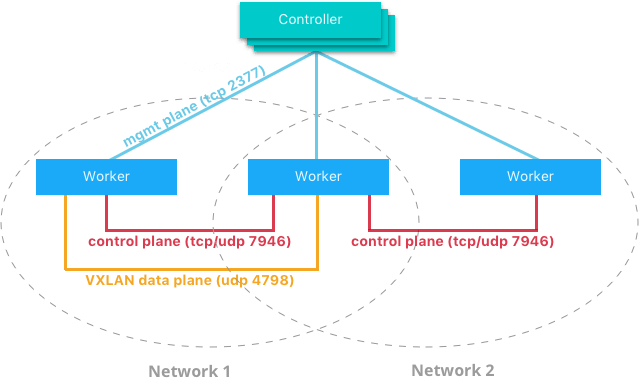 Overlay networks rely heavily on this Network Control Plane. It uses standard VXLAN to encapsulate container traffic and send it to other containers. Basically, VXLAN is an encapsulation format that wraps Layer 2 segments with an IP/UDP header, and then send it over Layer 3 networks. In this case, the Layer 2 frames come from a container. This “underlay” header provides transportation between hosts on the underlay network, while the overlay is the stateless VXLAN tunnel, that exists as point-to-multipoint connections between each host participating in the overlay network.