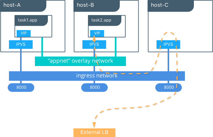 In this picture, a service is created with two replicas, on the appnet overlay network. We can see that the service is exposed on port 8000 on the three nodes. This is great, because traffic destined for app can be forwarded to any node. In this case, there is an external load balancer, that just happens to forward the request to the only node that does not have an instance of the service. This request is handled and forwarded by the IPVS on the third node, which redirects it to one of the actual containers on the cluster for that service, using the ingress network and therefore the aforementioned method of load balancing. Neat.