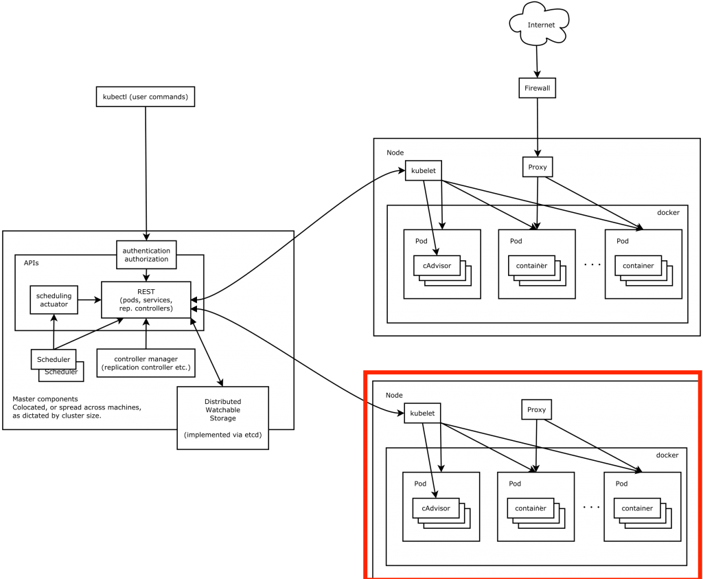 The Worker node is composed of a kubelet, and a proxy (kube-proxy). You can see these components inside the red square, in the diagram below.