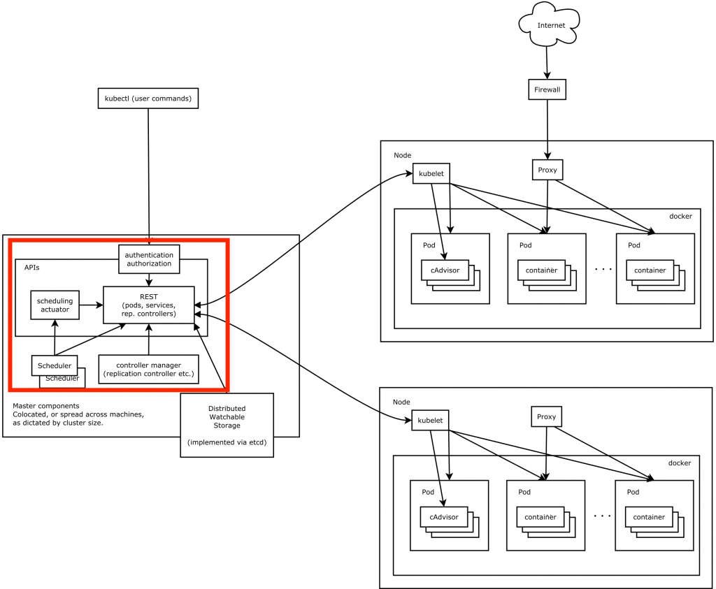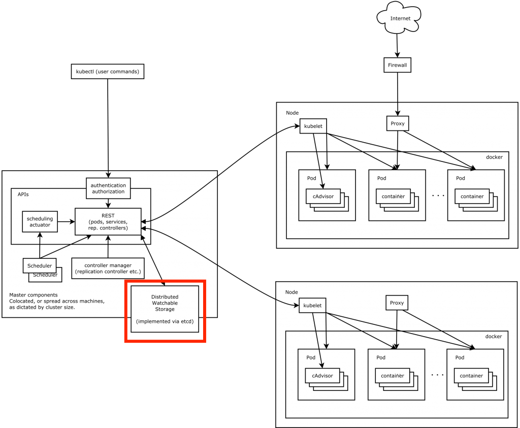 This architecture diagram specifies a set of master components, but not a Master node per-se. You will probably notice that the Distributed Watchable Storage is considered among these components. Nevertheless, we will not install it on the same node. Our Distributed Watchable Storage will be a separate component (more on this later).