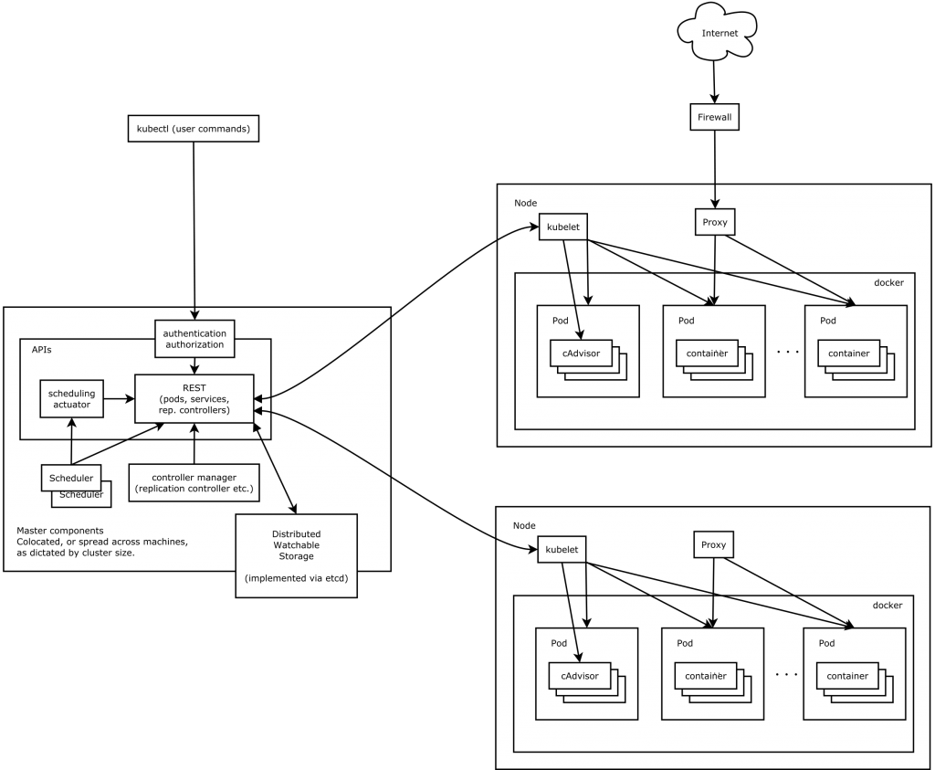The API server exposes the Kubernetes API (duh). It processes REST operations, and then updates etcd consequently. The scheduler binds the unscheduled pods to a suitable worker node. If none are available, the pod remains unscheduled until a fitting node is found. The controller manager server does all the other cluster-level functions, such as endpoint creation, node discovery, and replication control. Many controllers are embedded into this controller manager, such as the endpoint controller, the node controller and the replication controller. It watches the shared state of the Kubernetes cluster using the API server, and makes changes on it with the intention of making the current state and the desired state of the cluster match.