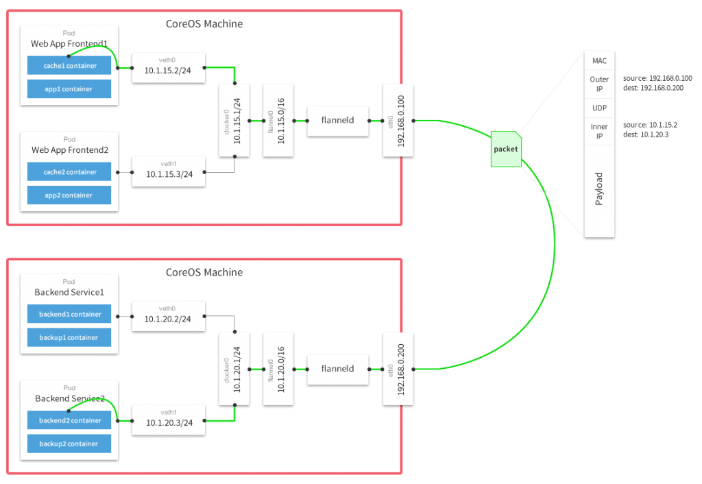 Flannel helps by giving each host a different IP subnet range. The Docker daemon will then assign IPs from this range to containers. Then containers can talk to each user using these unique IP addresses by means of packet encapsulation. Imagine that you have two containers, Container A and Container B. Container A is placed on Host Machine A, and Container B is placed on Host Machine B. When Container A wants to talk to Container B, it will use container B's IP address as the destination address of his packet. This packet will then be encapsulated with an outer UDP packet between Host Machine A and Host Machine B, which will be sent by Host Machine A, and that will have Host Machine B's IP address as the destination address. Once the packet arrives to Host Machine B, the encapsulation is removed and the packet is routed to the container using the inner IP address. The flannel configuration regarding the container/Host Machine mapping is stored in etcd. The routing is done by a flannel daemon called flanneld.