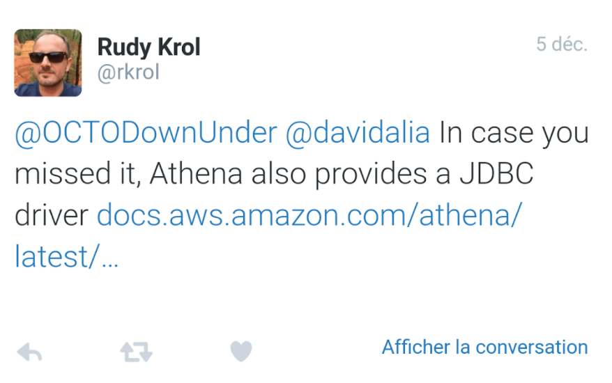 Of course, Athena is not the panacea for all use cases. It is "just" a query service in a console: you cannot plug it to any publishing layer (Business Objects, Tableau or even d3.js data visualisation framework), there is no way to use Athena APIs so far, or to parameterize queries, and it works only on top of S3.