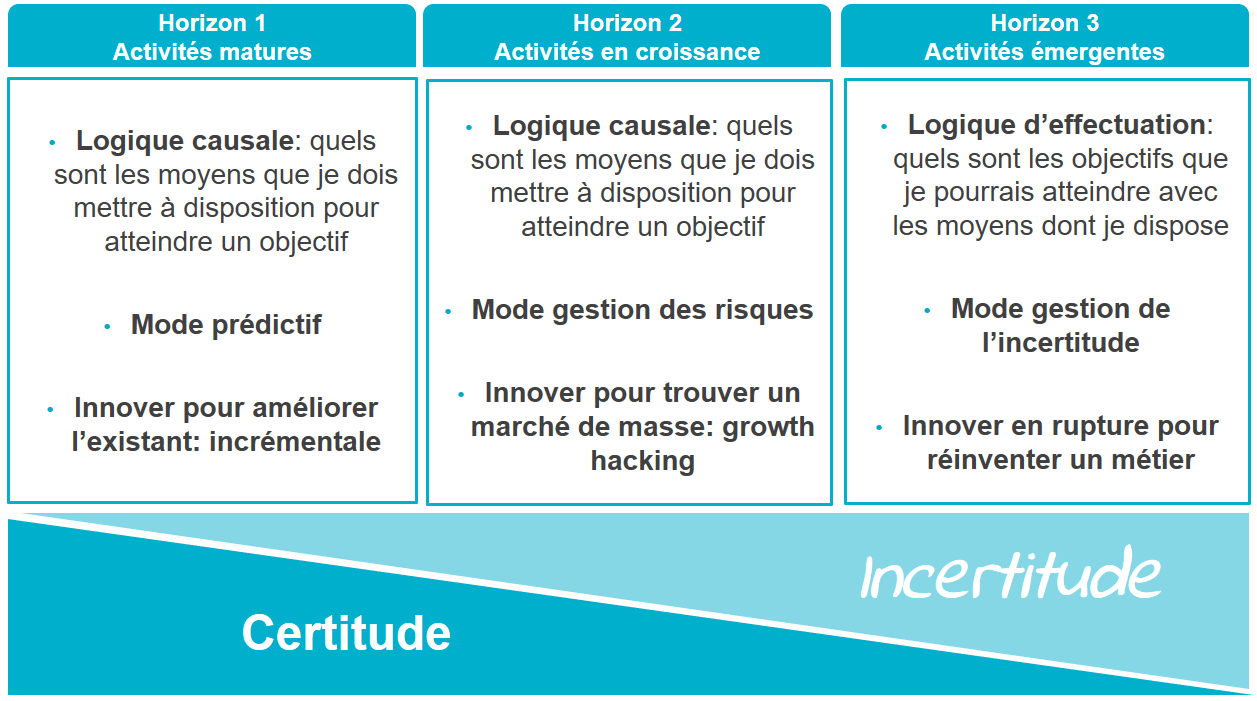 Si l’horizon 3 fait fantasmer beaucoup de gens c’est un environnement peu confortable car il faut être à l’aise avec l’inconnu et en même temps être d’une rigueur implacable dans la validation de ses hypothèses. Etre capable de recommencer de nombreuses fois et ne pas avoir peur de l‘échec voire d’être capable d’en faire son moteur. Retenez bien que ce n’est finalement pas donné à tout le monde. A chaque horizon ses compétences. Chaque horizon est bien. Le but n'est pas forcément d'être dans l'horizon 3 pour être heureux/reconnu/épanoui. Les horizons correspondent à des organisations différentes servant des objectifs différents pour l'entreprise.