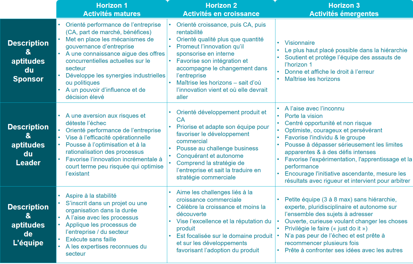 Dans cet article, nous prolongeons donc nos réflexions et tentons de définir selon les horizons les types de profils et leurs aptitudes selon leur rôle dans l’entreprise : le sponsor, le leader d’équipe et l’équipe en elle-même.
