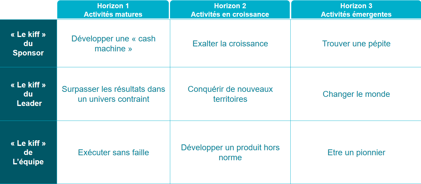 Les objectifs et les horizons de ces intrapreneurs « exfiltrés » ou libérés de leur environnement traditionnel (géographique/physique et hiérarchique) sont différents de ceux auxquels ils sont habitués. Nous avions d'ailleurs détaillé les différents horizons et leurs objectifs ici: l’innovation dans les grands groupes bancaires.
