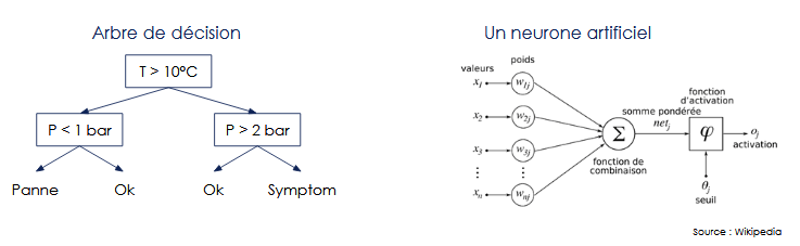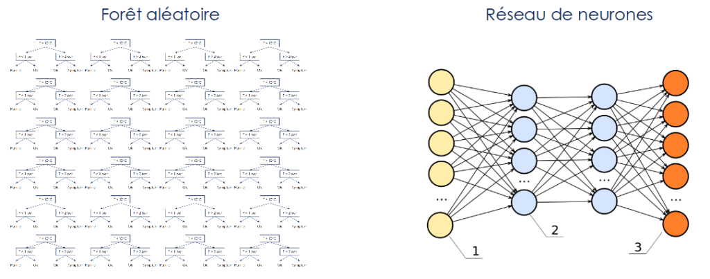 L’algorithme d’apprentissage. Il permet d’optimiser les poids à mettre sur les neurones ou les seuils à mettre dans un arbre pour avoir un modèle entraîné. Par exemple, si le technicien nous demande “pourquoi le seuil sur la température est à 10°C” il faudra lui expliquer le mécanisme d’apprentissage qui a mené à cela. La figure 5 présente la distinction outil mathématique / algorithme d’apprentissage pour quelques exemples de modèles de machine learning.