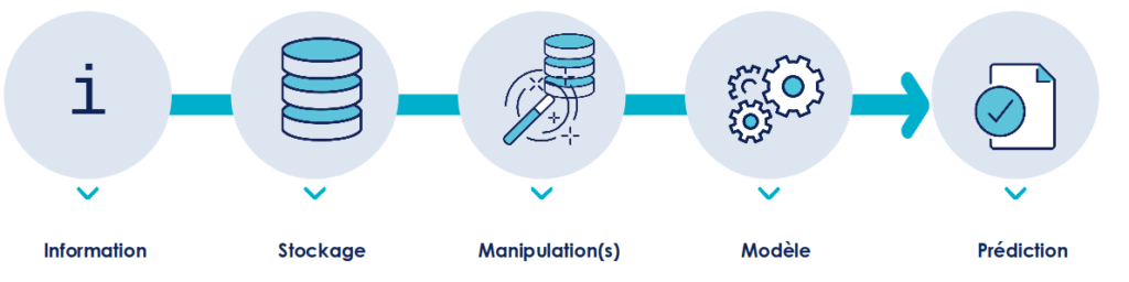 Ces données sont ensuite transformées. D’abord avant d’entrer dans le système de data science : elles sont manipulées, transformées, copiées dans d’autres outils … Puis dans le système de data science, il y a la création d’indicateurs métier (Par exemple : Température / Pression) et d’indicateurs du Data Scientist (Par exemple : transformée de Fourier, moyenne mobile).