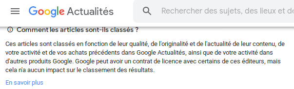 De l’humain, en faisant de la pédagogie, en vulgarisant ce qui se passe. Par exemple, sur Google Actualité, il y a un message qui explique comment les résultats sont classés (cf figure 8). Il est aussi possible de mettre en place une démarche “marketing” pour identifier l’argument qui fera mouche et qui permettra de comprendre rapidement.