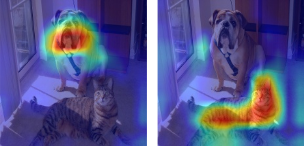 Les cartes de chaleur, pour interpréter les résultats de réseaux de neurones, datent de 2017. Elles permettent d’afficher sur une image les zones qui ont contribué à la prédiction. Plus la zone a servie plus elle est rouge, moins elle a servie plus elle est bleue. Sur la figure 12. sur l’image de gauche on voit que c’est le bas du museau qui a donné la prédiction “chien” et sur l’image de droite, c’est l’ensemble du corps du chat qui a donné la prédiction “chat”.