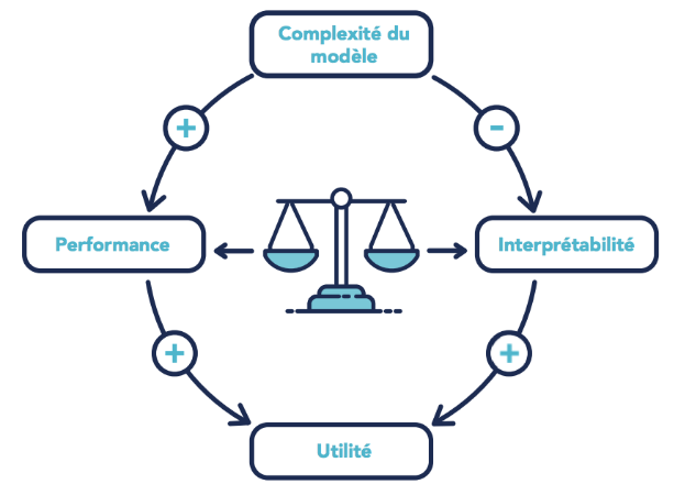 L’ajout de complexité est un moyen d’augmenter la performance d’un système de data science. Cette pratique a cependant le défaut de diminuer l’interprétabilité. L’interprétabilité et la performance servent l’utilité du modèle. Il est donc important de trouver le bon niveau de complexité nécessaire pour maximiser l’utilité du modèle.