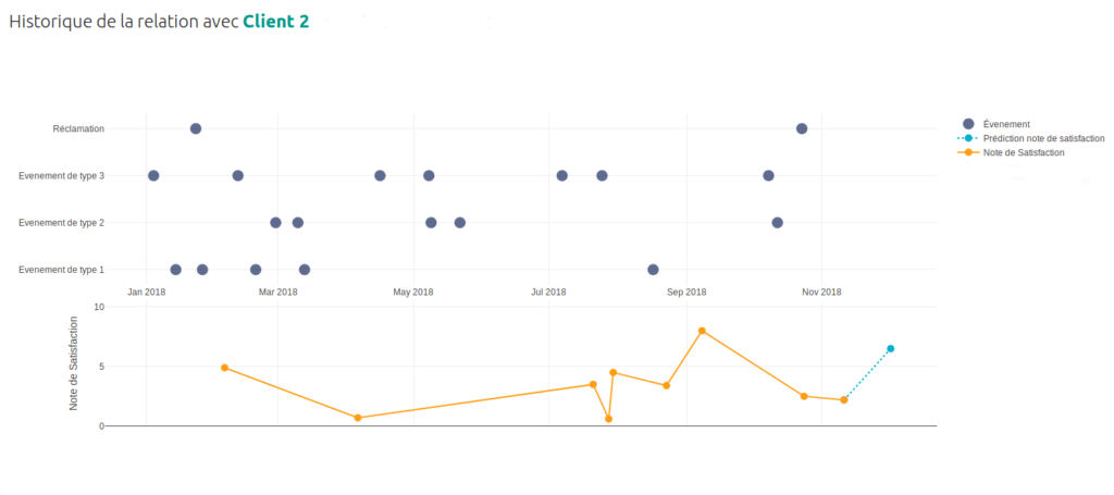Cette visualisation permet aux utilisateurs de re-contextualiser rapidement la situation de l’utilisateur, de voir l’impact des événements passés sur la satisfaction et ainsi d’identifier si des actions doivent être menées pour améliorer la satisfaction client. Il est possible de créer toutes sortes de visualisations, pour trouver celle qui sera la plus impactante il faut la co-construire avec les utilisateurs.