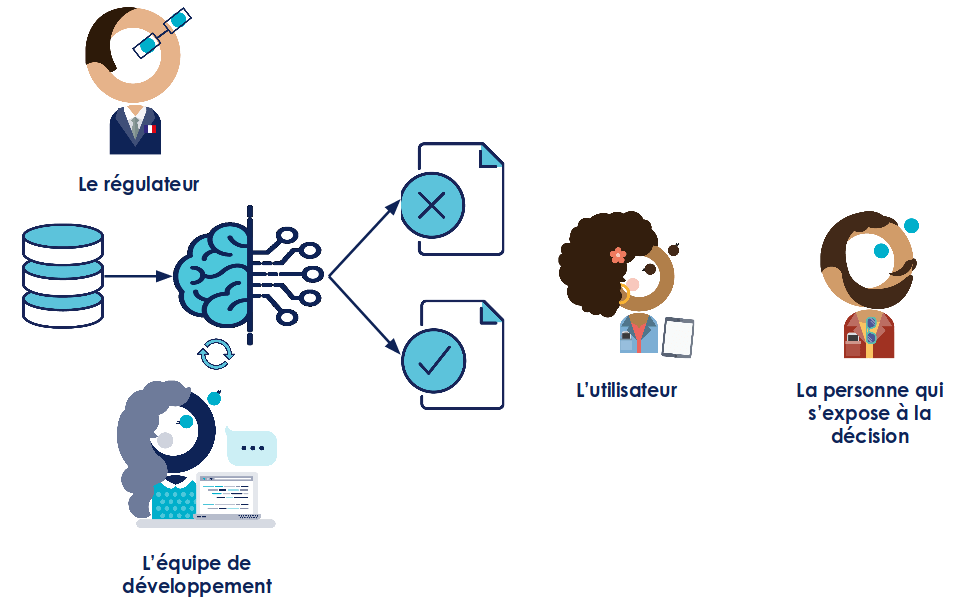 Les personnes qui s’exposent à la décision, c’est-à-dire les personnes qui sont concernées par la prédiction. Un exemple est un patient à qui on dit “vous êtes atteint d’un cancer”. Pour pouvoir accepter la décision, le patient voudra comprendre ce qui a fait que le système est arrivé à cette conclusion. Exigence qu’un patient a déjà vis-à-vis de son médecin.