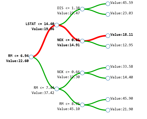 Sur la figure 10, on peut voir que pour l’individu prédit, la variable “RM” a contribué à modifier la prédiction de 22,6 à 19,96 au premier noeud. Puis la variable “LSTAT” de 19,96 à 14,91. Enfin la variable NOX a, elle, augmenté la prédiction de 14,91 à 18,11.