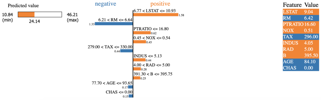 On voit la valeur exacte de chaque feature de l’instance dans le tableau de droite, mais c’est surtout le graphe du milieu qui nous en apprend le plus sur la contribution de chaque feature à la prédiction. Par exemple, le fait que la valeur de LSTAT (9.04) soit comprise entre 6.77 et 10.93 semble justifier sa contribution positive avec une importance de 1.58
