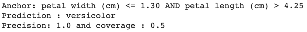 Cette méthode tente d’expliquer une prédiction sous forme de règle (appelée ancre) de type: IF feature1=valeur1 AND feature2=valeur2 …. THEN PREDICT prédiction.