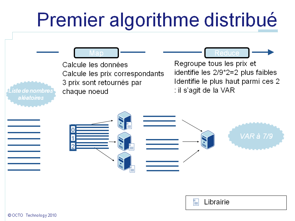 D'un point de vue métier, l'estimation des risques est devenue de plus en plus importante pour les institutions financières afin de prévenir les pertes sur des marchés fluctuants. De plus, les nouvelles normes de régulation telles Bâle III et Solvabilité (Solvency) II prennent en compte la VAR dans leurs exigences. L'efficacité des calculs de ces valeurs est un pré requis forme pour le système d'information des institutions financières. A travers un exemple très simple, cet article a montré que ces calculs reposent sur la génération de données aléatoires et la réalisation de calculs mathématiques pour évaluer la valeur du portefeuille pour chaque échantillon. Le nombre d'échantillons requis et parfois la complexité dans la méthode de calcule nécessitent des architectures spécifiques pour terminer ces calculs dans des temps raisonnables. La grille de calcul est l'architecture la plus à jour pour répondre à ce genre de problématique. Le pattern map reduce est l'une des façons les plus simples d'écrire un algorithme qui bénéficie de l'accélération rendue possible par le calcul en grille. La compréhension des besoins métiers est un point important pour optimiser le code. Dans cet exemple, ignorer les résultats intermédiaires permet d'accélérer le calcul. Dans un autre article, je décrirai une implémentation de cet exemple en utilisant un intergiciel (middleware) de grille de calcul et je donnerai quelques chiffres de performance.