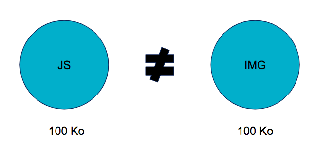 En effet contrairement à une image, un fichier javascript devra être parsé et exécuté par le navigateur et monopolisera son thread principal en plus de son téléchargement. Il y a donc un véritable enjeu à diminuer le plus possible la quantité de javascript envoyée côté client.