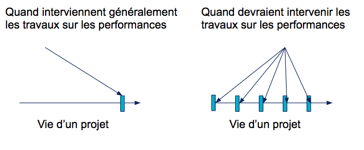 Les performances web ne constituent pas toujours une priorité dans un projet, particulièrement dans les premières phases de développement. Cela peut s’expliquer par un doute initial sur le rapport temps/investissement à consacrer aux performances alors qu’au demeurant le site ou l’application semble fonctionner correctement. Dans cette optique une équipe commencera à s’intéresser à la notion de performance uniquement quand elle rencontrera des ralentissements significatifs. Dans cette situation il sera très coûteux de s’extraire des problèmes de lenteur alors qu’une répartition des travaux sur l’ensemble du projet aurait permis d’anticiper ce risque à coût moindre.