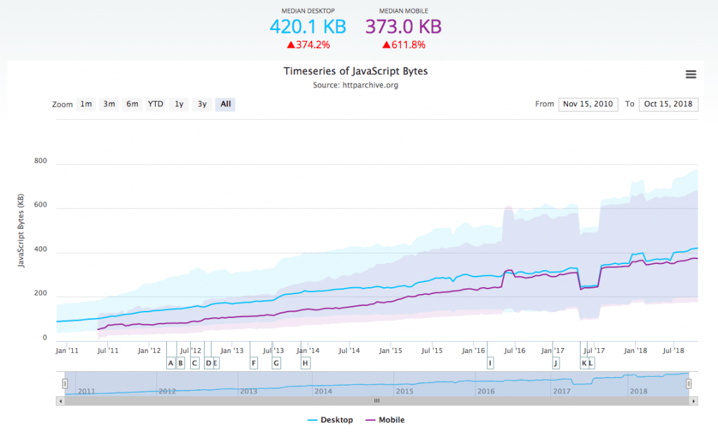 La taille moyenne des pages suit une tendance de constante augmentation depuis plusieurs années. Cela constitue déjà en soi un problème, mais en y regardant de plus près celui-ci est encore plus impactant si la ressource qui augmente est le javascript.