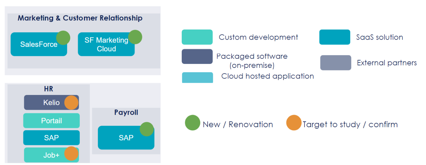 Mapper le patrimoine applicatif existant avec les domaines fonctionnels, ou avec les domaines IT pour les communs technologiques, permet de visualiser l’utilité des actifs du SI. On peut ensuite y introduire un côté dynamique en montrant par exemple le lien avec la stratégie technologique (Cloud, Saas…) ou la stratégie de transformation en cible via des codes couleur (nouvelles applications, rénovation, décommissionnement…).