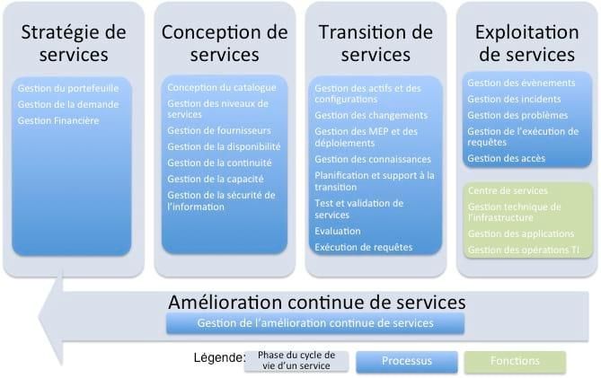 Image 1. Phases du cycle de vie Stratégie de services :Transformer le SI en un actif stratégique de l’entreprise en identifiant les besoins des clients pour définir les services qui produisent de la valeur et que respect le coût de fourniture. Il se traduit par la construction d’un portefeuille de services.Conception de services :Concevoir un service en prenant en compte tous les éléments liés au development et á l'exploitation. La solution doit réponde aux attentes du client, aux niveaux de service engagés et à ce qu’ils soient en phase avec la capacité de l’infrastructure et l’architecture du SI.Transition de services :Mettre en place de nouveaux services et de mises à jour dans un environnement de production d’une façon sécurisée et effective en préservant la bonne exploitation du système.Exploitation de services :Assurer la bonne fourniture du service aux utilisateurs en respectant les niveaux de services engagés. Assurer le monitoring du service, la bon gestion des incidents et des problèmes ainsi que le traitement de demandes de services et d'accès.Amélioration continue de services :Mesurer et suivre les différents processus de gestion de services pour aider à définir les actions correctives afin d’améliorer les services existants et son alignement avec les objectifs stratégiques.