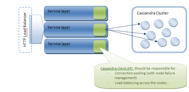 Cassandra utilise Thrift (même si la version 0.6 introduit l’utilisation du protocole Avro). Nous l’avons déjà évoqué mais Cassandra est responsable du routage des requêtes sur le nœud approprié et le client peut donc requêter n’importe lequel des nœuds. Néanmoins, l’API Thrift par défaut ne fournit aucun mécanisme de pool ou de répartition de charge entre les nœuds. Concernant le pool de connexions, les principaux manques sont, à mon avis, (1) la capacité de répartir les requêtes entre tous les nœuds du cluster et (2) la capacité de requêter automatiquement un autre nœud si la première tentative échoue (à cause d’un nœud tombé…).
