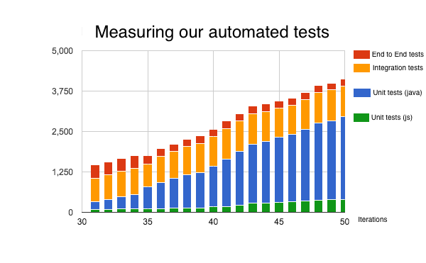Deleting bad tests was not the only way to reverse the trend. We have written far more tests than before (see the figure below). But the ones we wrote were running faster. The 45 minute build is now 13 minutes long.