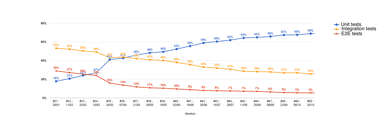 After that, we set a direction to move towards and gather all our energy. We needed to test faster and more reliably. Which brought us to the same newly born desire: more Unit tests than Integration tests than End to End tests. Let’s be clear: we did not invent the testing pyramid model. We have just adopted it collectively.