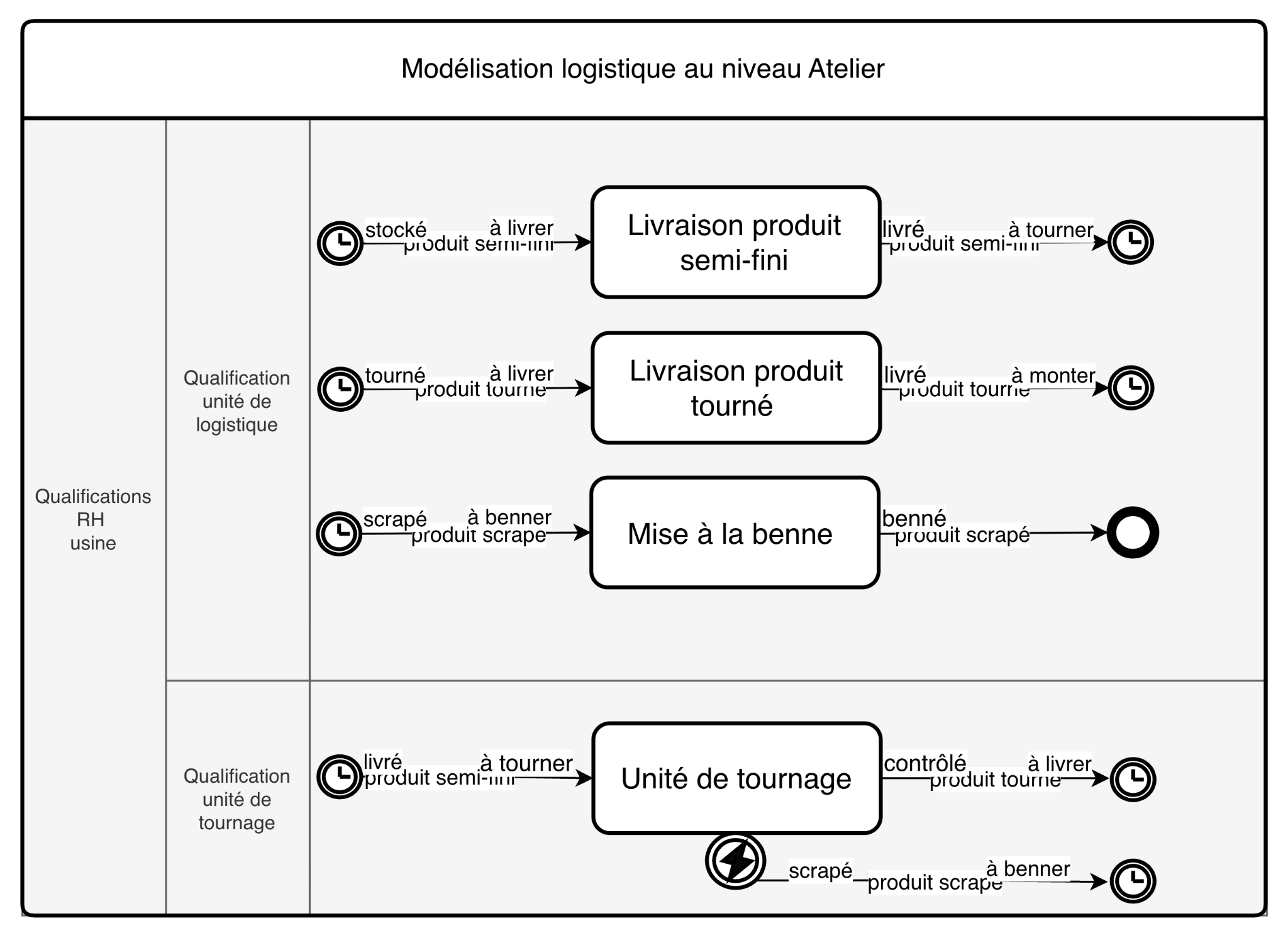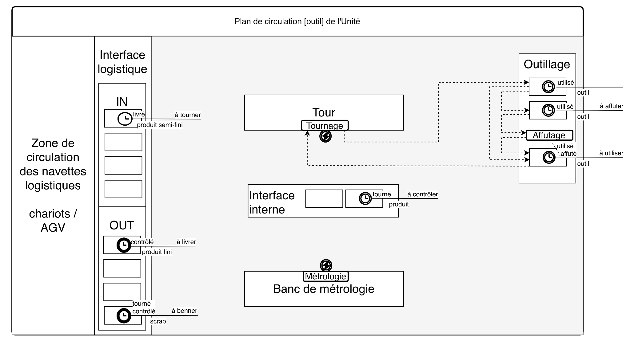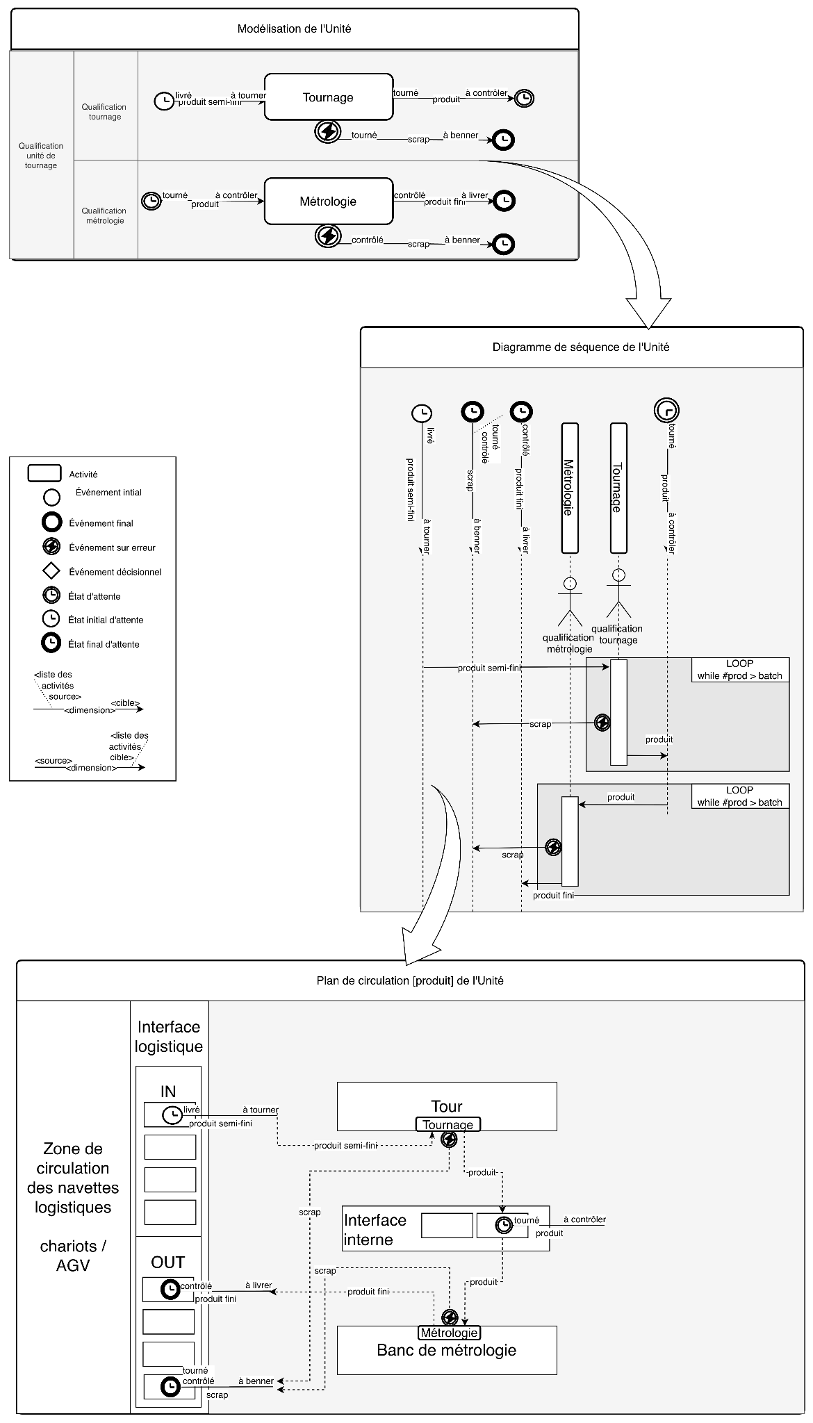 Pour établir le lien entre la modélisation abstraite et le terrain, Fig_12 reprend et simplifie celle de l’unité de tournage de Fig_9. Cet exemple volontairement simple n’intègre que deux activités Tournage et Métrologie. La modélisation est complétée avec deux représentations complémentaires: un diagramme de séquence et un plan de circulation des produits.