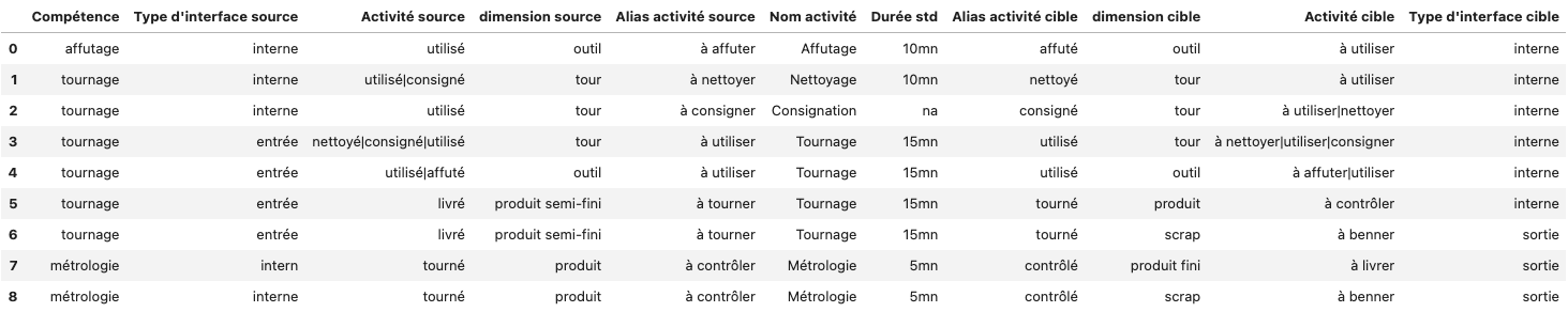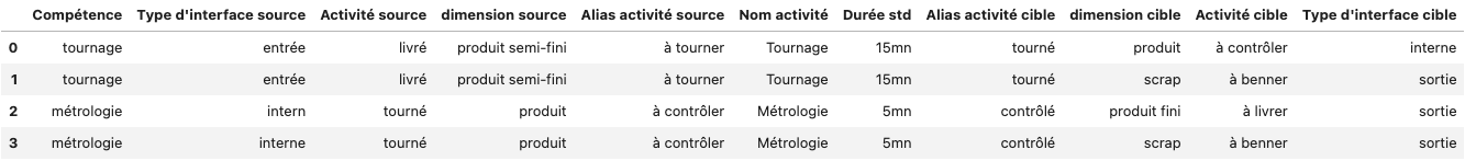 L’expert modélisation s’intéresse davantage au graphe du modèle Fig_18.1 pour en structurer les données. En l'occurrence le modèle du graphe d’états passe de 4 lignes, Fig_13, à 9 lignes Fig_19. Il produit aussi le référentiel type à configurer sur site Fig_20 qui passe de 6 à 12 états par rapport à Fig_14.