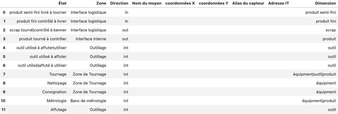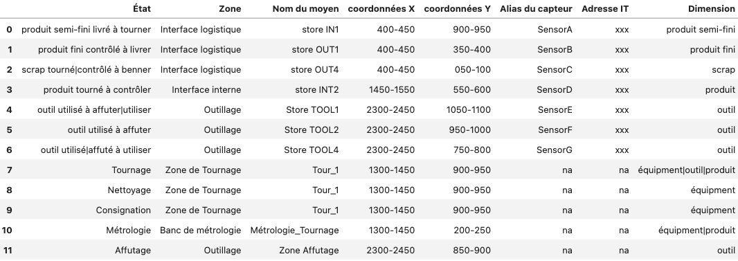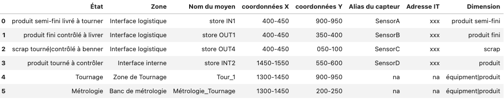 Il serait néanmoins possible d’ajouter des données IoT ou de consommation mesurées sur le tour. Dans un tel cas, les informations d’alias et d’adresses IT des capteurs seraient renseignées sur Fig_21 ligne #7. Ce référentiel par états permet de distinguer les données à prendre en compte en fonction du contexte. Ainsi, si la valeur na (non-applicable) est affectée aux lignes #8 et #9, le JNS sait que les données d’IoT ne doivent pas être prises en compte pendant les activités de nettoyage ou de consignation du tour.