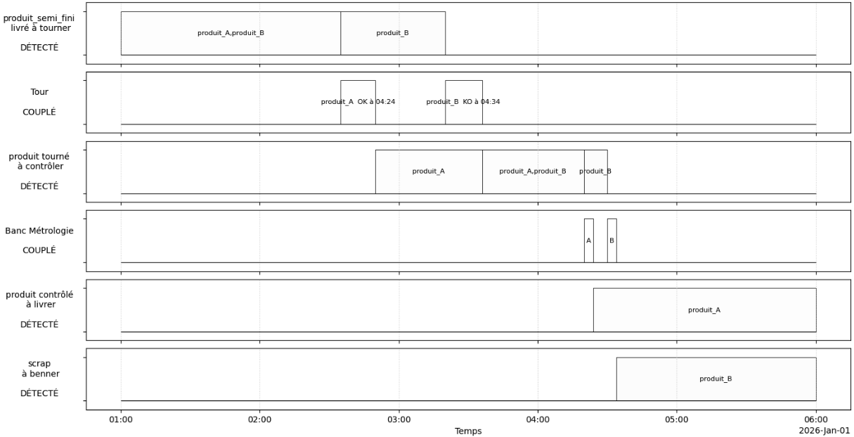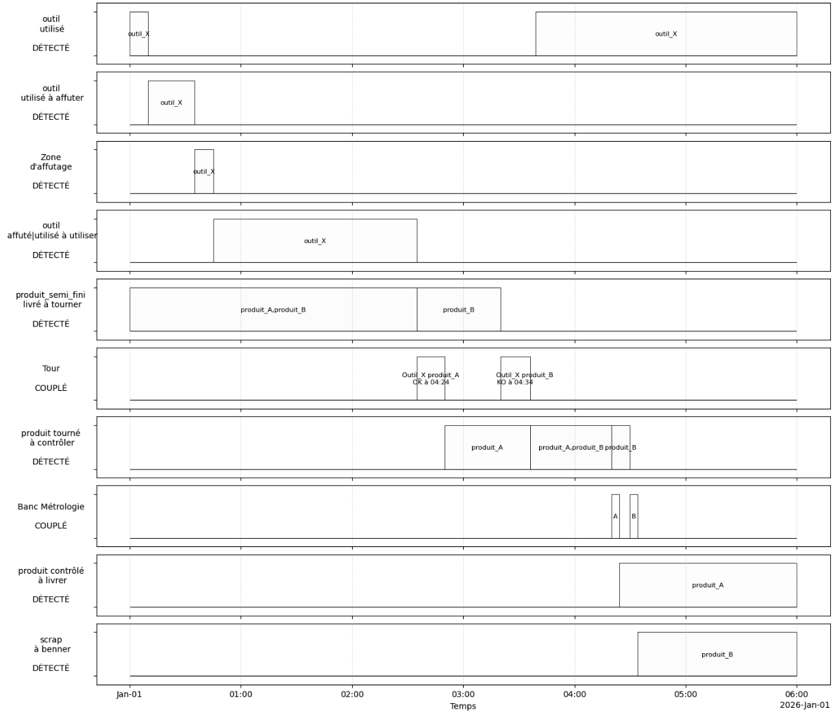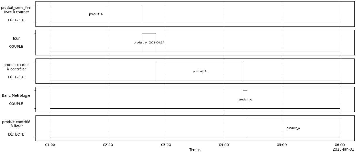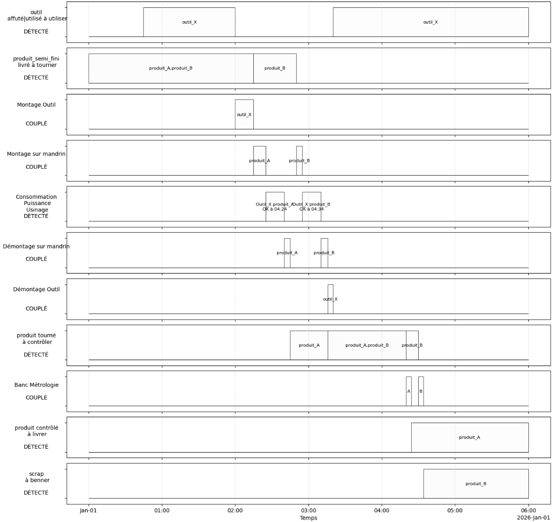 Ainsi en Fig_22, Produit_A étant disponible depuis la veille en qualité de semi-fini et Outil_X ayant fini d’être affûté à 0h45, le fait que le tournage ne débute qu’à 2h35 indique soit l’indisponibilité de la personne qualifiée, soit l'indisponibilité préalable de Tour pour cause de consignation ou nettoyage. La configuration des capteurs décrite dans cet exemple ne permet pas de lever l’indétermination. Pour cela, il faudrait ajouter une source de données comme un capteur de tension sur le tour qui détecterait sa disponibilité.