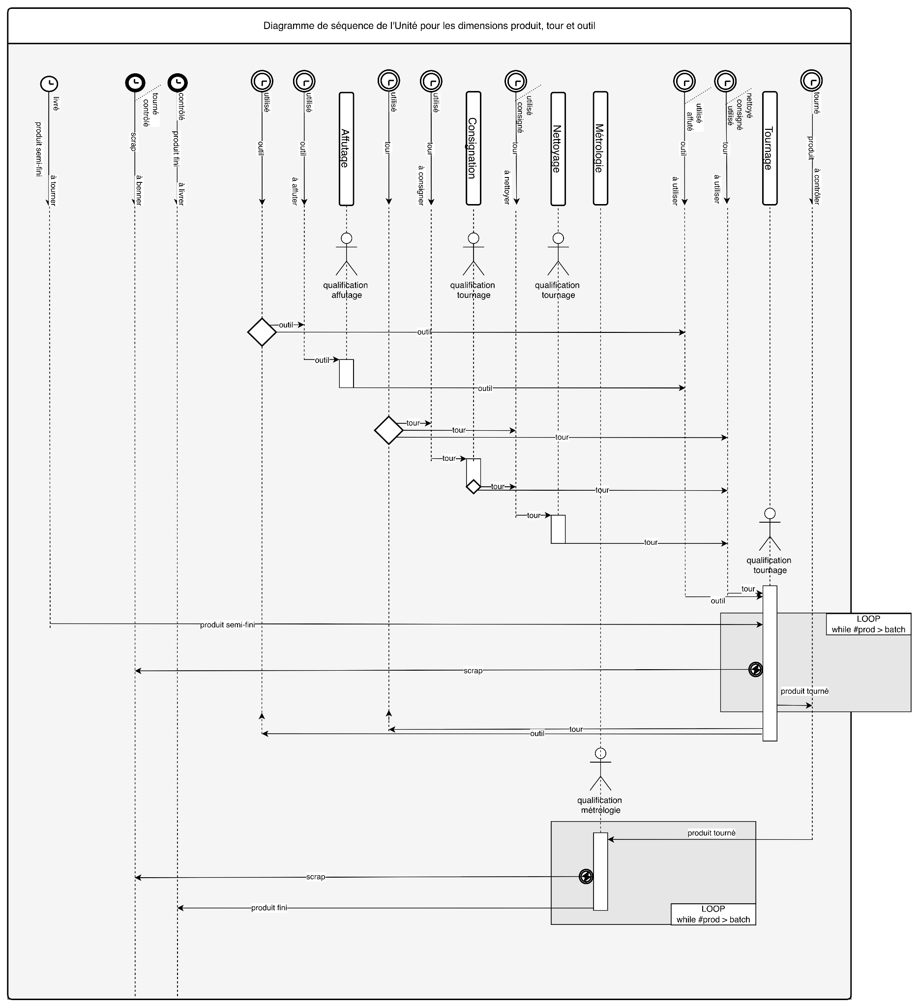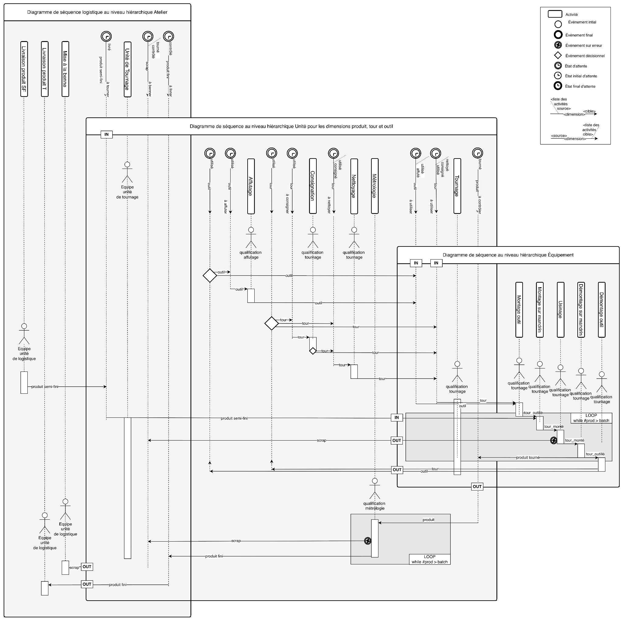 Le diagramme de séquence représente la circulation des dimensions d’un état à l’autre. En colonne figurent les 2 états d’activité et les 4 états de transition. Son déroulement chronologique suit les dimensions qui changent d’état via les flèches horizontales. Dans le cas présent, les dimensions correspondent uniquement au produit sous 4 formes (semi-fini, produit, fini, scrap). On note également les zones grises correspondant aux activités, labellisées par le nombre d'instances répétées en fonction de la taille de lots planifiée (ici batch représente le nombre d’itérations de boucle).
