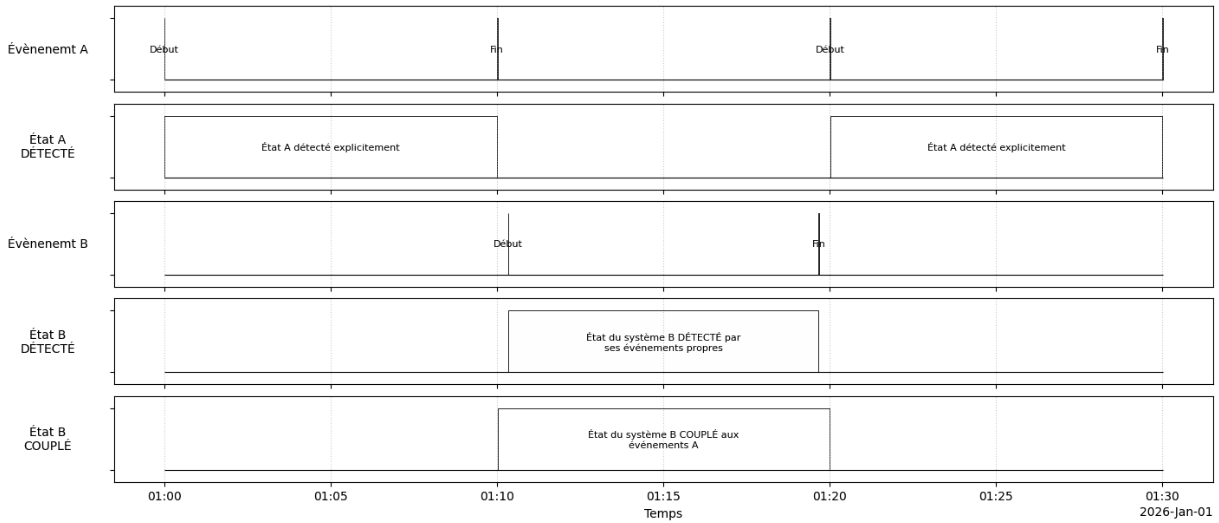 Fig_15 décrit un système de deux états A et B qui se succèdent. Si leurs systèmes physiques respectifs produisent des événements de début et de fin (Événement A et Événement B en ordonnée), leurs états sont explicitement détectés (État A et État B en ordonnée).