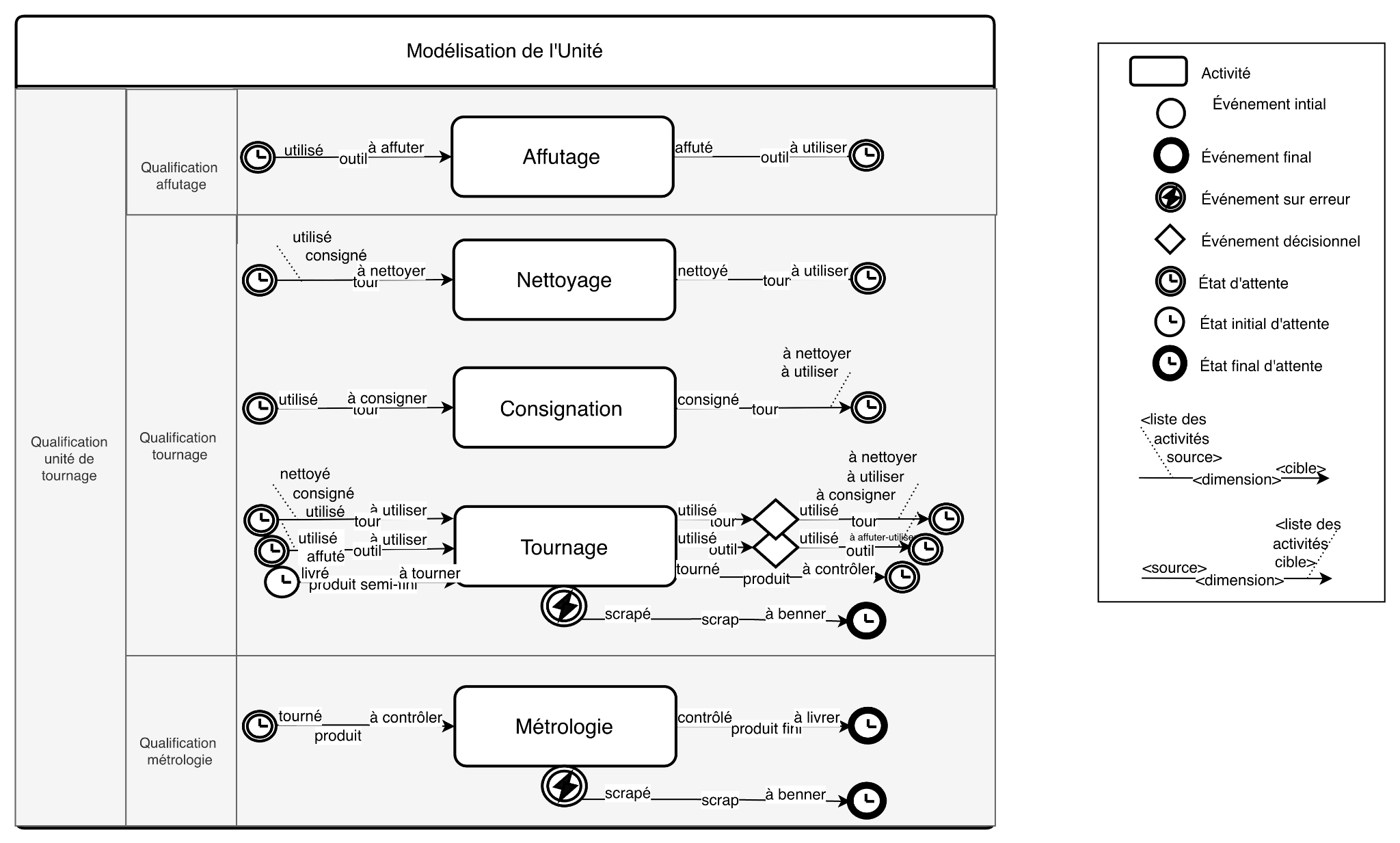 La nouveauté sur l’analyse chronologique Fig_22 se situe en amont des activités de tournage. En effet, le tournage est l’état qui nécessite la disponibilité des dimensions tour (fixe), produit (mobile) et outil (mobile), en plus de la personne ayant la qualification de tournage, non représentée.