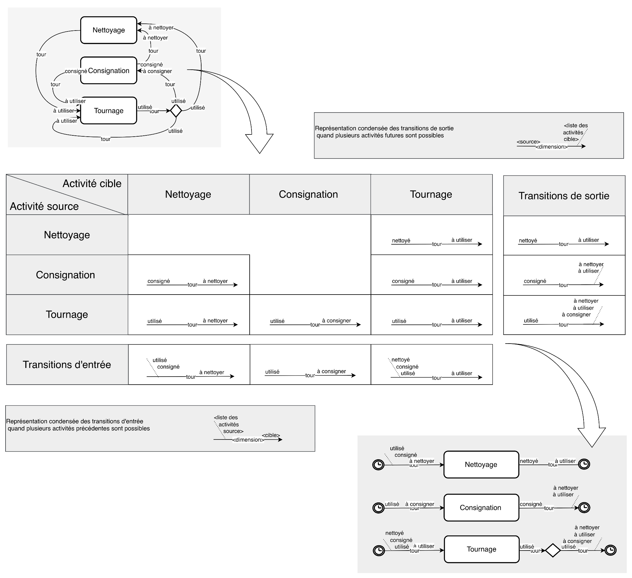 Au-delà de l’hétérogénéité de style, la prise en compte dans une machine à états de tous les états de transition pose un problème de complexité de la représentation graphique. Fig_6 représente seulement deux dimensions et quatre activités et deviendrait illisible s’il fallait représenter une unité de production comportant cinq dimensions et plusieurs dizaines d'activités.
